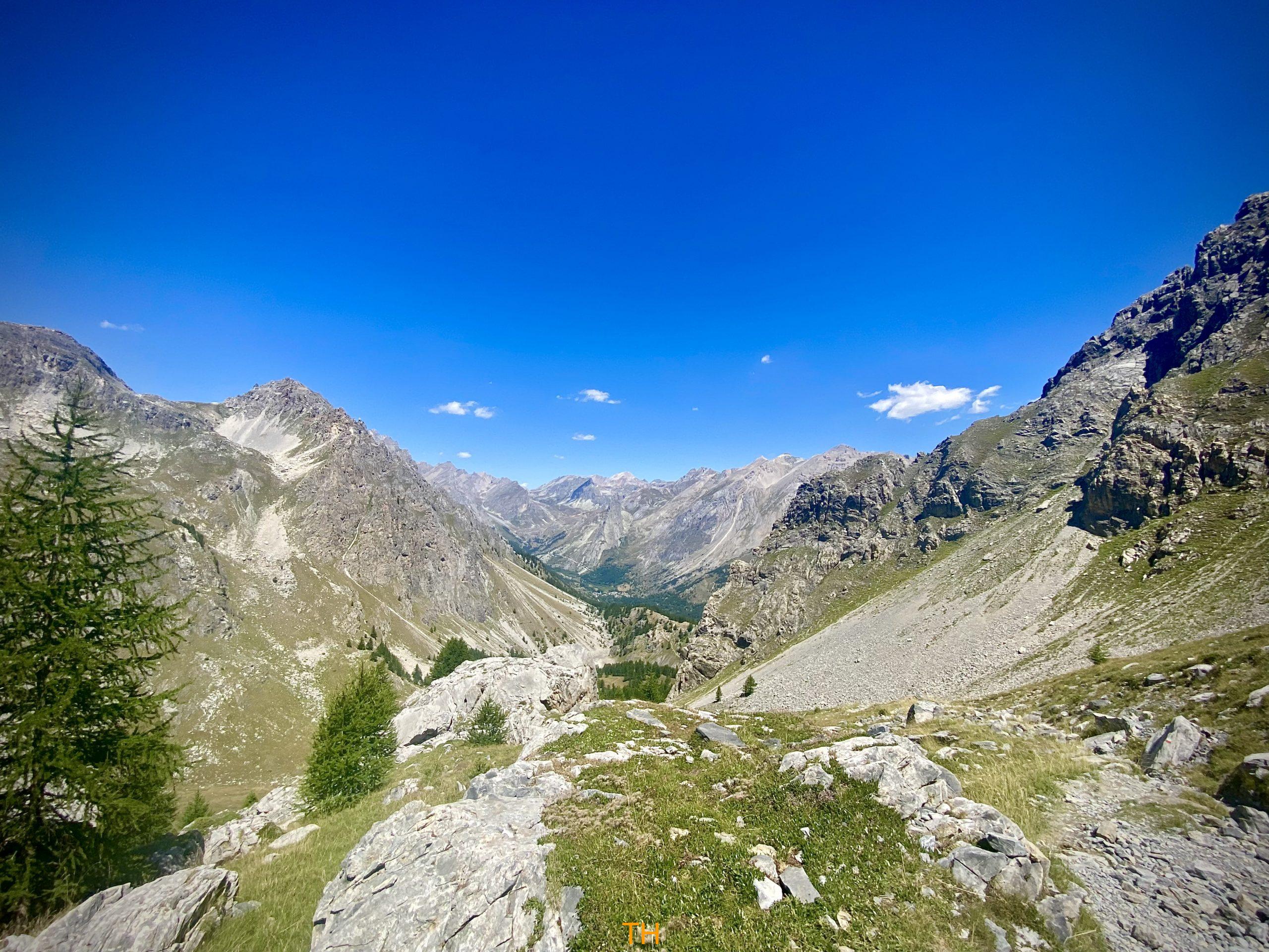 Wir erreichen die Grenze zu Frankreich, gehen hier ein Stück entlang. Natürlich bergauf. Vorbei an weiteren Bergseen, Ausblicke in weitere Bergpanoramen. Die Sonne scheint unermüdlich und der Wind ist manchmal so stark, dass wir die Caps abnehmen, damit sie nicht davonfliegen (keine Lust, so ner Mütze hinterherzulaufen, man muss Kräfte schonen). Wenig andere Wanderer sind hier unterwegs. Ein französische Familie hat den gleichen Weg wie wir, ein italienisches Pärchen läuft die verkürzte Version und wir treffen sie immer mal wieder.